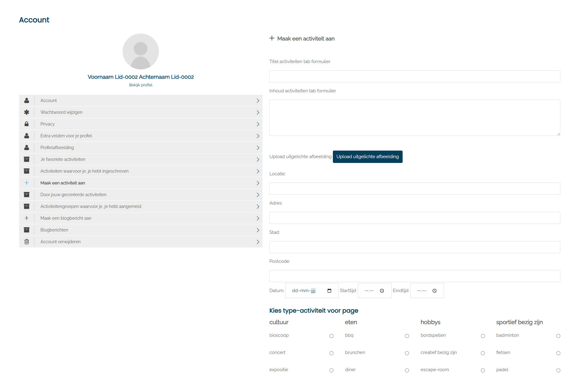 Op de account pagina kun je in de tab “Maak een activiteit aan” je eigen activiteit aan maken.